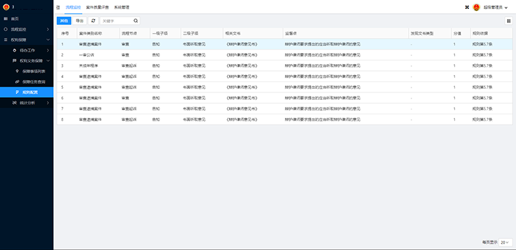 系統(tǒng)根據(jù)相關(guān)規(guī)則,系統(tǒng)自動(dòng)排查,針對(duì)案件流程管控設(shè)定相關(guān)規(guī)則,設(shè)定規(guī)則時(shí)可針對(duì)案件類別、流程節(jié)點(diǎn)、相關(guān)子項(xiàng)、相關(guān)文書、監(jiān)管點(diǎn)、問(wèn)題類型、分值、規(guī)則依據(jù)等。并可針對(duì)每項(xiàng)規(guī)則設(shè)定啟動(dòng)條件、關(guān)閉條件、期限起點(diǎn)、期限終點(diǎn)預(yù)警時(shí)點(diǎn)等。目前需完成規(guī)則200余項(xiàng)。