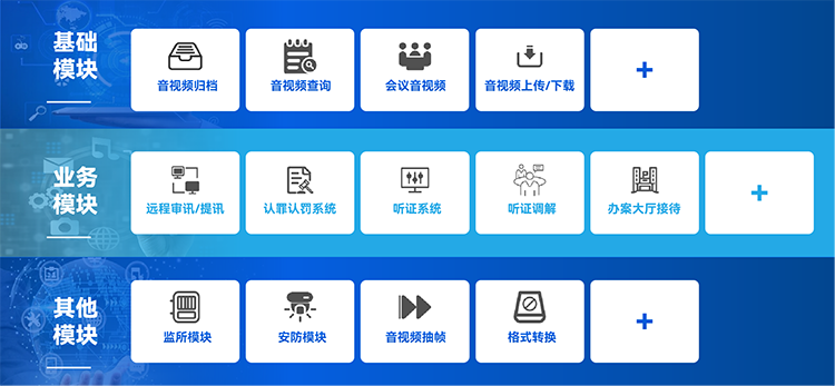 歸檔、存儲、會議、上傳、下載、遠程審訊/提訊、認罪認罰系統、聽證、調解辦案大廳接待、音視頻抽幀、格式轉換